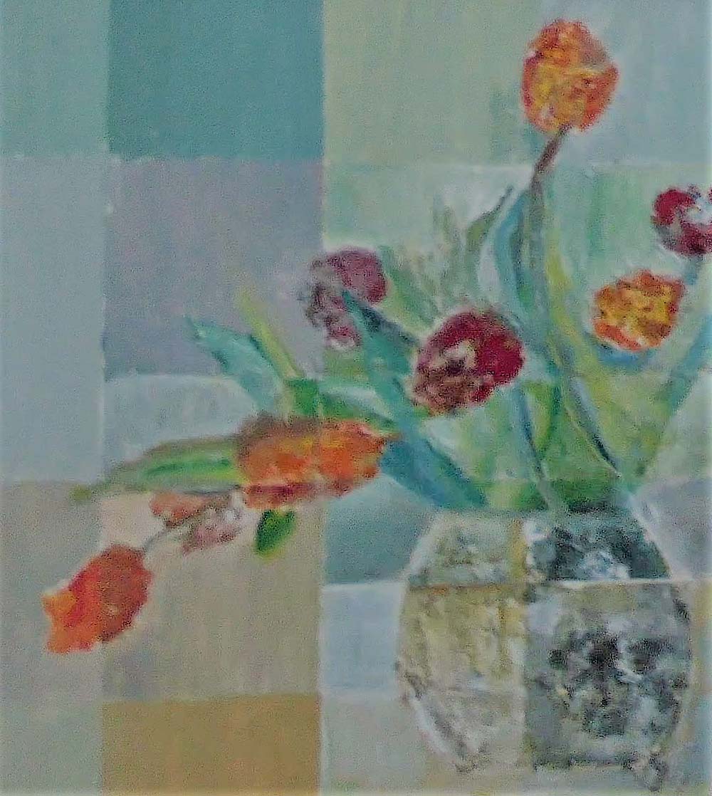 Het werk ontstaat intuïtief. Het is een spel met lijn, vorm en kleur. Naar mijn idee is dit recente werk met drie figuren een kleurrijk palet geworden. Het drukt uit een verlangen naar licht en harmonie met de natuur.