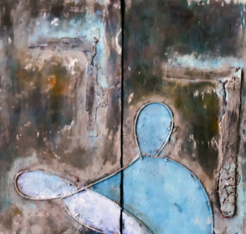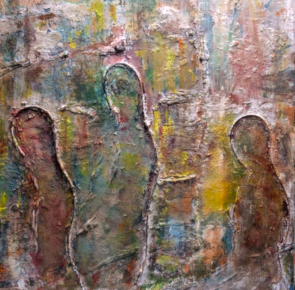 In het werk met de drie figuren heb ik verschillende lagen acrylverf verwerkt. En voor het aanbrengen van verschillende structuren is onder andere hout, zand en karton gebruikt.